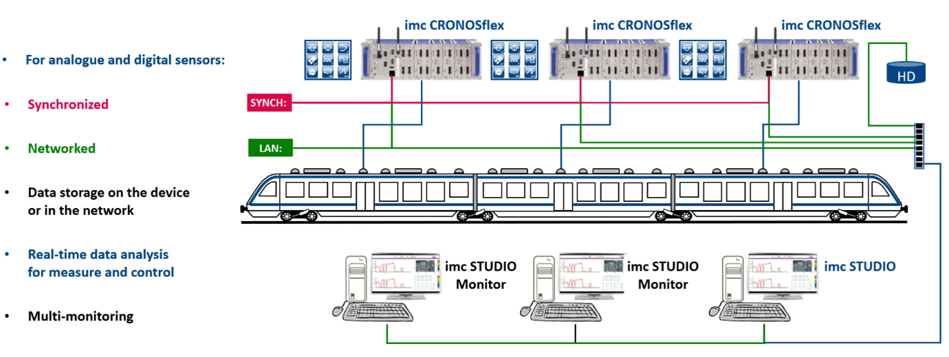 Zusammen bieten die modularen imc-Systeme Ingenieuren eine flexible, verteilte Messarchitektur, die von einzelnen Subsystemen bis hin zu kompletten Zügen skalierbar ist.