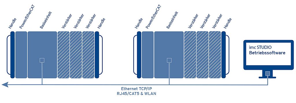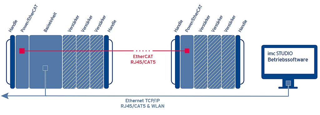 Neben dem modularen Aufbau als zentrales DAQ-System, lässt sich imc CRONOS-XT auch räumlich verteilt einsetzen. So können Messverstärker nahe der Messstelle platziert werden, um die empfindlichen und teuren Messleitungen auf ein Minimum zu reduzieren. Die Vernetzung erfolgt dabei über den EtherCAT-basierten imc Systembus. Alle Daten laufen synchron in der Basiseinheit zusammen.