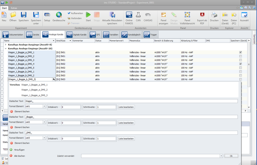 imc STUDIO Setup dient zur vollständigen Konfiguration Ihrer Messaufgabe. Über eine tabellarische Darstellung erhalten Sie einen schnellen, strukturierten Überblick über ihre Einstellungen. Sortier- und Filterfunktionen helfen auch bei vielen Kanälen die Übersicht zu behalten. Gleichzeitig können Sie auf intuitive Weise die Darstellung jederzeit an Ihre Bedürfnisse anpassen und so z.B. Parameter ausblenden oder zusammenfassen, feste Einstellungen hinterlegen oder eigene Parameter hinzufügen. Tabellen-Zellen stellen übersichtlich die aktuell gewählten Einstellparameter dar und bieten beim direkten Klick sofort ein passendes Popup Menü zur Auswahl der möglichen Optionen an.