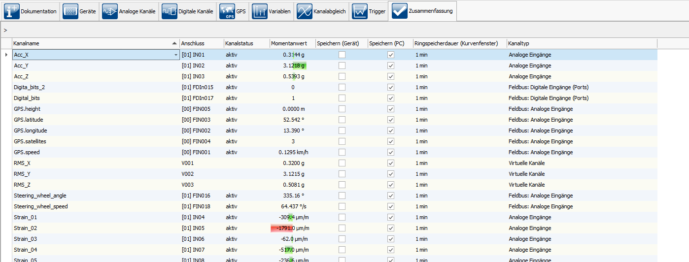 Für mehr Übersicht sorgt die neue Konfigurationsseite “Zusammenfassung”. Unabhängig vom Kanaltyp, zeigt diese alle konfigurierten Kanäle inklusive Momentanwert, Übersteuerungsanzeige und Speichereinstellung. So hat der Anwender die wichtigsten Daten auf einer Seite im Blick, ohne zwischen verschiedenen Seiten wechseln zu müssen.