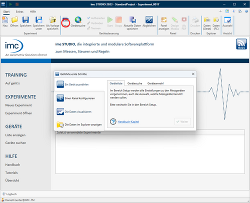 Eine geführte Tour hilft neuen Anwendern beim Einstieg und erklärt Schritt für Schritt die Funktionen der Software - angefangen bei der Auswahl des Gerätes und der Kanalkonfiguration bis hin zur Anzeige der Messdaten. Der Assistent kann auf der imc STUDIO Homepage mit einem Klick auf "Auf geht's" gestartet und jederzeit wiederholt werden.